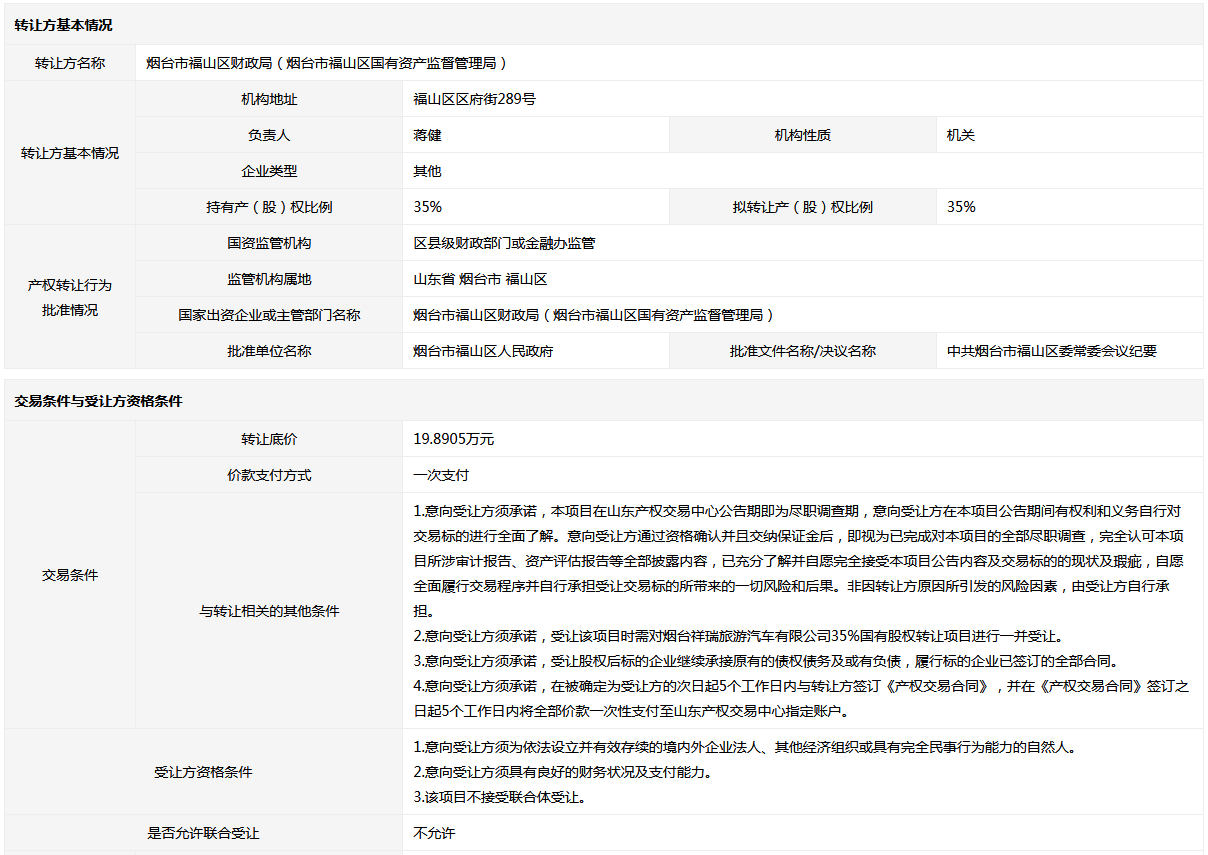 轉讓方: 煙臺市福山區(qū)財政局(煙臺市福山區(qū)國有資產監(jiān)督管理局)